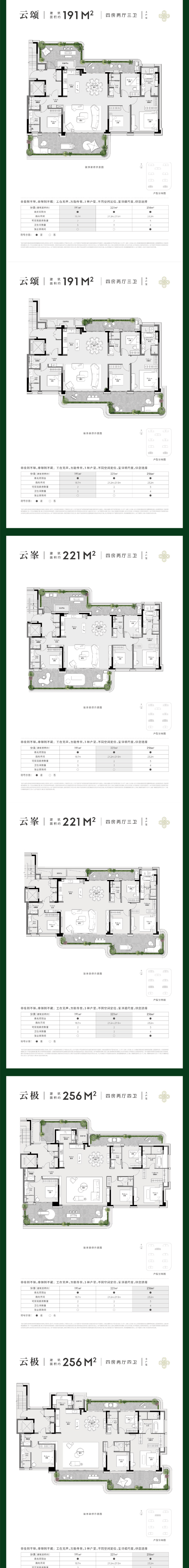 项目主力户型为191㎡、221㎡、256㎡三种大平层设计,均为四室两厅三卫/四卫格局,具体特点包括: