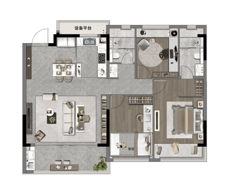 藏峯117㎡:升级版三房,主卧套房设计,配备独立衣帽间,约6.6米宽景阳台