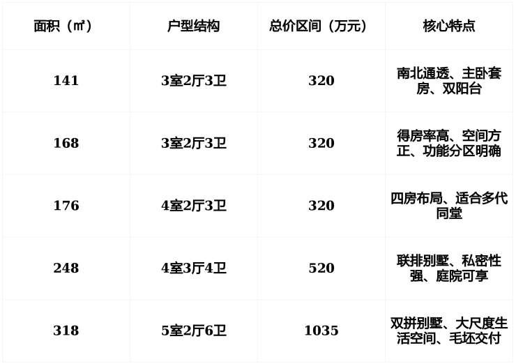 户型丰富:涵盖双拼(约318㎡)、联排(约248㎡)、叠加别墅(141/168/176㎡),满足多代同堂与个性化生活需求