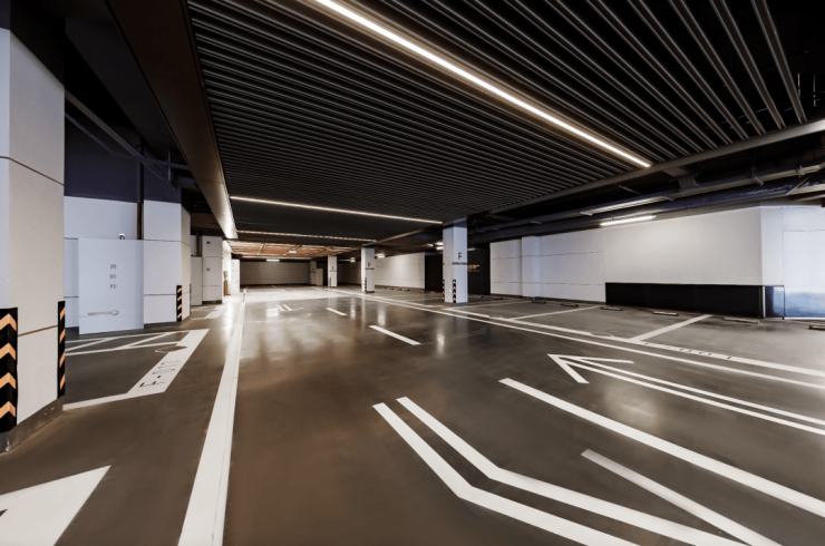 地库内的每一处细节,都是无锡星河湾匠心品质的生动注脚。马蹄石坡道以建筑线条为灵感,仿铜不锈钢镶边与金属吊顶相互辉映,侧墙的仿石纹转印铝板在灯光映射下,勾勒出颇具层次感的立体光影画卷;主车道上方,铝格栅吊顶与仿铜金属铝板碰撞出艺术韵律,动态光影随着车速流动变幻;金刚砂地面暗藏艺术密码,水磨石与保加利亚石材相映成趣。这里不再只是停车的场所,更是一座流动的地下艺术长廊。