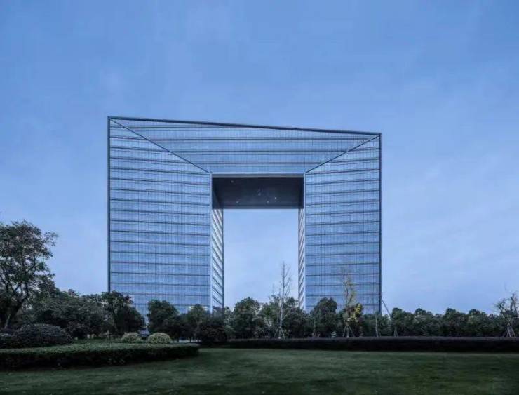 全幕玻璃和拼配铝板,搭配游走交叉的金属线条赋予建筑物通透干练的效果,转角内约5.3°的微斜切面,视野更好,造型也更加流动,湛蓝的玻璃幕墙反射出钱塘江的东去的水波,也见证了之江拂晓晨曦间的车水马龙。