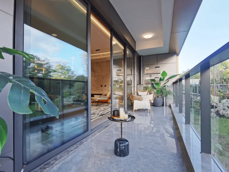 188–248㎡洋房大平层:三至四开间朝南,配备L型跑道阳台或270°转角阳台,最大阳台面宽达约18米,实现“阳台即风景”