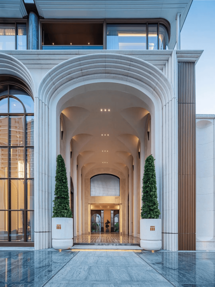 建筑由九米设计操刀,外立面采用铝板、石材、玻璃与金属线条,打造悬浮感与雕塑感兼具的现代建筑。标志性12米通高石材拱券、贝金米黄与宝格丽绿奢石铺装,尽显庄重雅致,被誉为“石材的博物馆” 。
