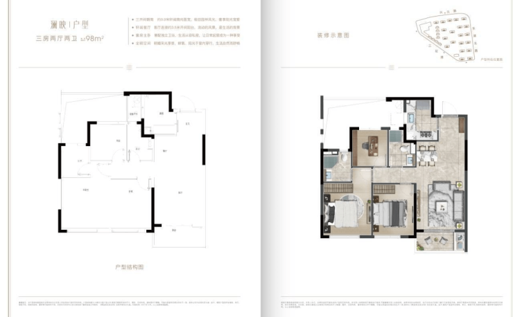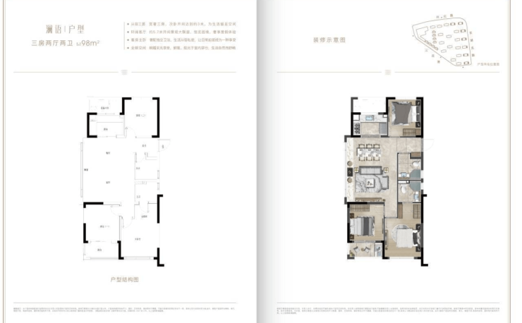 华景川湖沁宸园售楼处电话:400 808 3612✔✔✔☎提供多样化的户型选择,满足不同家庭的需求。项目包括精致小户型、宽敞三居室以及豪华复式等多种户型。户型设计注重空间利用与功能分区,让居住更加舒适。此外,每个户型都配备了良好的采光和通风设计,确保居住质量。98㎡|澜映|三房两厅两卫