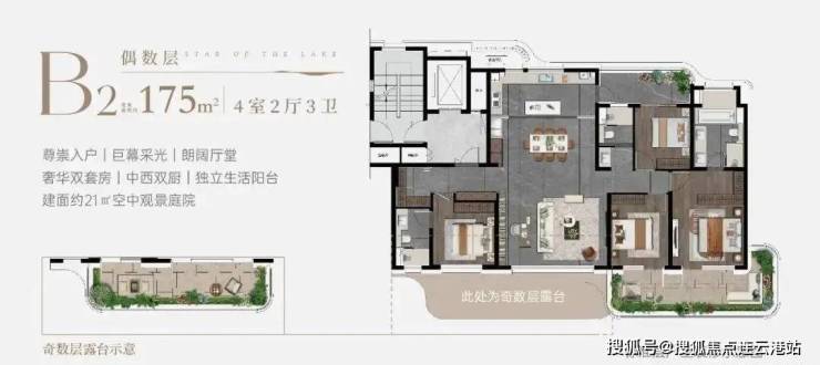 "一方云端庭院,让院落情结与现代技艺完美融合——约15-35㎡太湖空中院落,270°环幕揽湖光,6米挑高引清风,既是瑜伽观星的诗意栖居,亦是烧烤派对的社交主场,重构峯层生活的精神容器。"