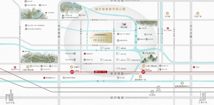 紧邻 中环西线 ,驾车15min可达昆山市中心,30min直达苏州工业园区。