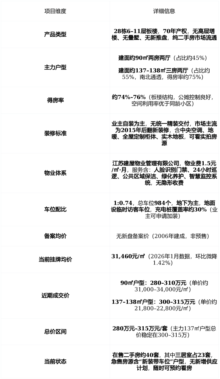 项目为 板楼结构 ,共 28栋6–11层住宅 ,总户数约1337户, 容积率2.08,绿化率54.31%人车分流+中央景观带 ,2024年完成 智慧社区升级478台高清摄像头、电子围栏、人脸识别门禁全覆盖无物业费上涨历史
