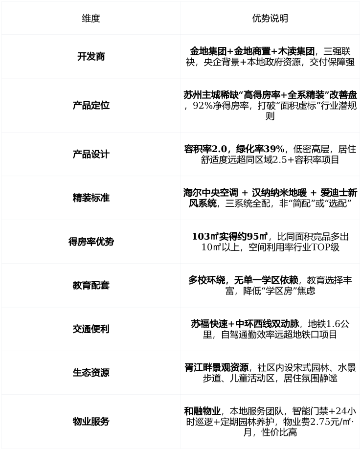 ✅ 核心结论:苏州主城稀缺高得房率改善盘,2026年3月集中交付,103–135㎡精装三房均价2万/㎡,新风+地暖+中央空调全配,对口多所公立名校,无学区房焦虑