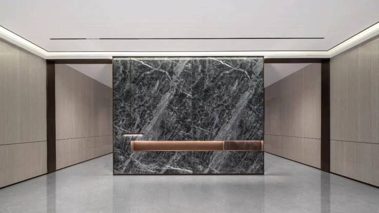 地库入户大堂,以奢阔层高和舒适尺度,勾勒空间非凡气度。将「璀璨星空顶」植入其中,高定雅致星空天幕,繁星光彩配合细腻的灯光渲染,宛如满天星河倾泻而下,呈现高品质的雅致归家之境。
