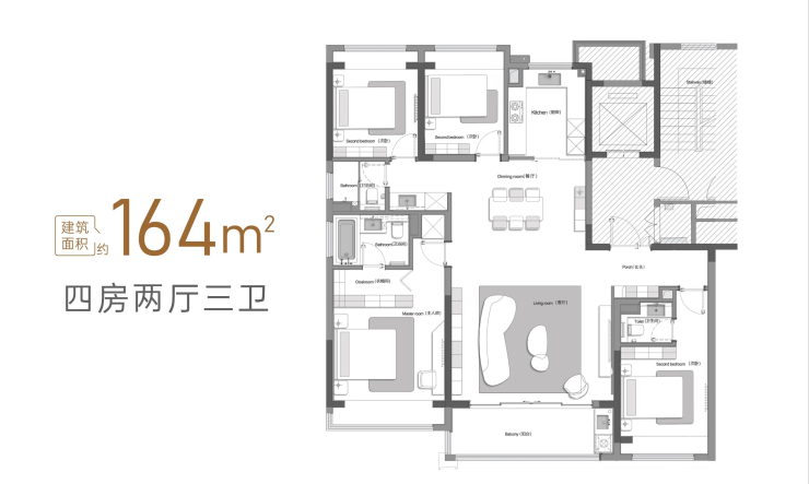 户型面积:主力户型164-239㎡大平层,精装交付,配备国际品牌建材(如大金中央空调、杜拉维特卫浴等)
