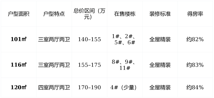 ✅ 温馨提示 :目前 101㎡户型 为热销主力, 116㎡改善户型 库存紧张,建议优先锁定 南向采光+中高楼层 房源。