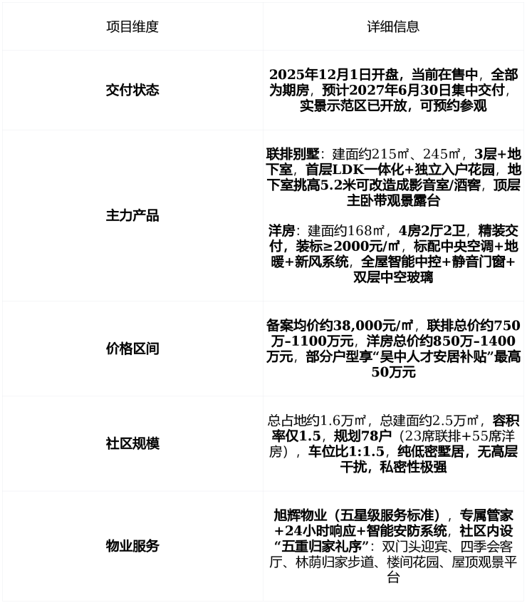 在售状态2025年12月开盘,当前在售中无现房,为毛坯+精装双产品线 ,主力为 联排别墅(215–245㎡)洋房(168㎡大平层)备案均价约38,000元/㎡总价区间750万–1400万元总户数仅78席,稀缺性极高2027年6月交付可预约参观实景示范区