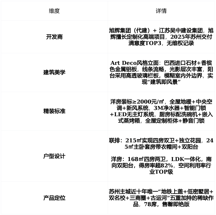 核心优势苏州主城罕见容积率1.5纯墅社区 + 步行150米直达地铁2/3号线“盘蠡路站” + 1公里内覆盖石路、观前、南门三大核心商圈 + 对口姑苏实验学校(振华分校)+胥江实验中学 + 毗邻千年古运河生态廊道 + 旭辉代建+江苏吴中建设双匠联袂 + Art Deco建筑美学+三重园林体系吴中主城近十年唯一“城芯低密墅居”未来绝版资产
