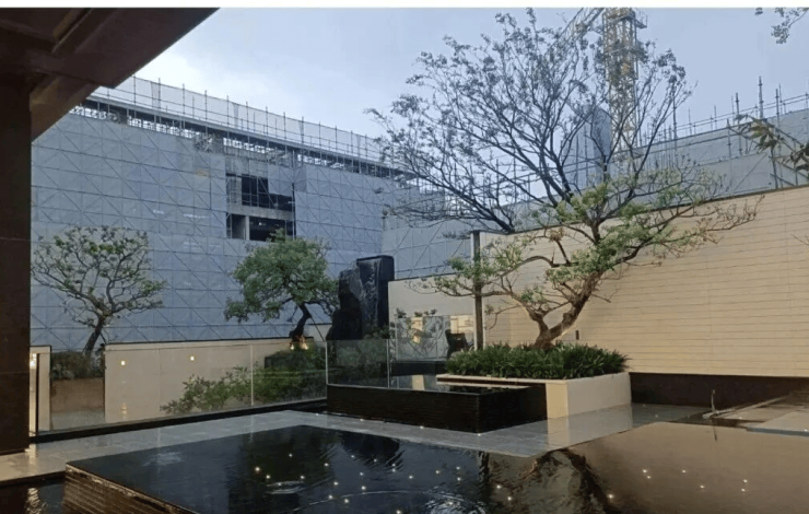门外碧波荡漾,锦鲤嬉戏其间;拱桥巧妙复刻网师园“引静桥”之韵,三步过涧,步移景异。150吨巨石精心堆叠,造就8米高龙门叠瀑,气势恢宏;其间“鲤鱼石”灵动欲飞,仿佛跃过山峦,尽揽无限风光。