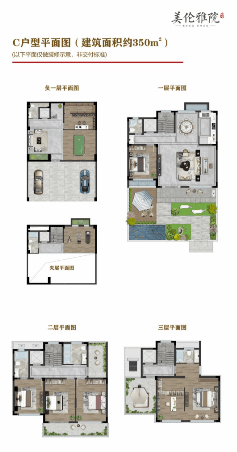 主力户型236-350㎡,地上3层+地下1层设计,地下层高5.8米,1楼层高3.6米,空间感突出