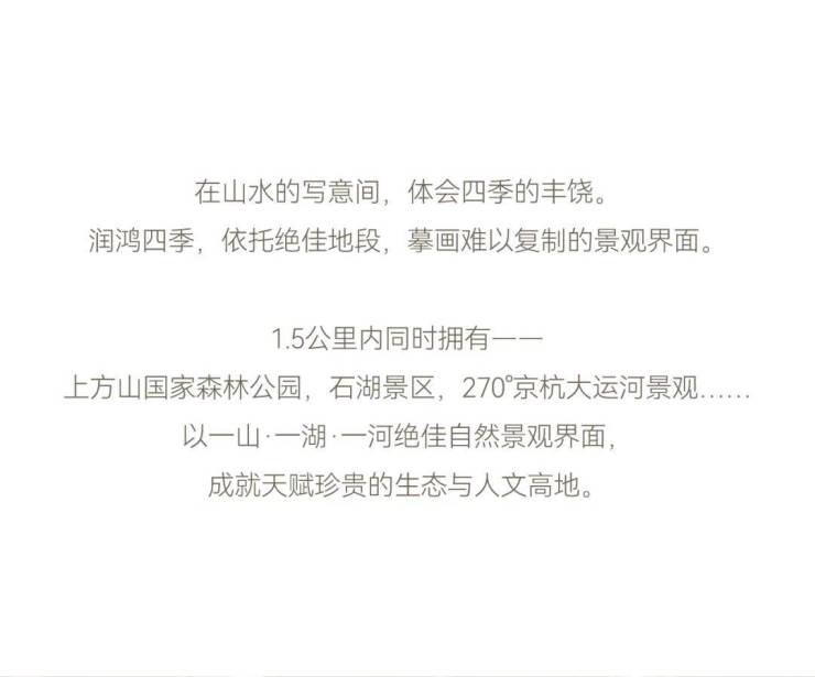 或许有人觉得,教育资源优势可以复制,但润鸿四季更绝的是,他永远有更多的惊喜给到你。上方山国家森林公园、石湖景区、京杭大运河,这“一山·一湖·一运河”的生态界面,谁看了不说一个字:绝!