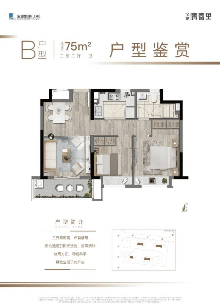 75㎡两房两厅一卫:南北通透,三开间朝南,得房率高达82%,U型厨房+独立玄关设计