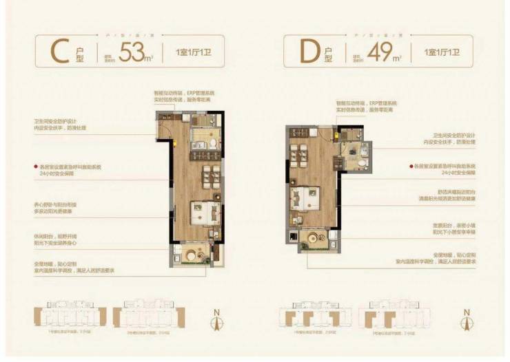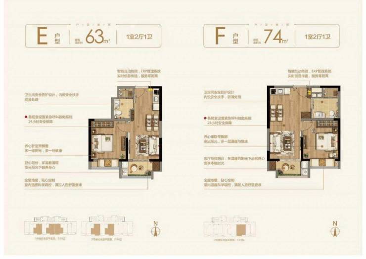 类住宅适老化设计,浅进深,充足采光;配置实木适老化家具,地暖、空调、家用电器,拎包入住;室内应急报警求助按钮;养老服务信息化智能终端。