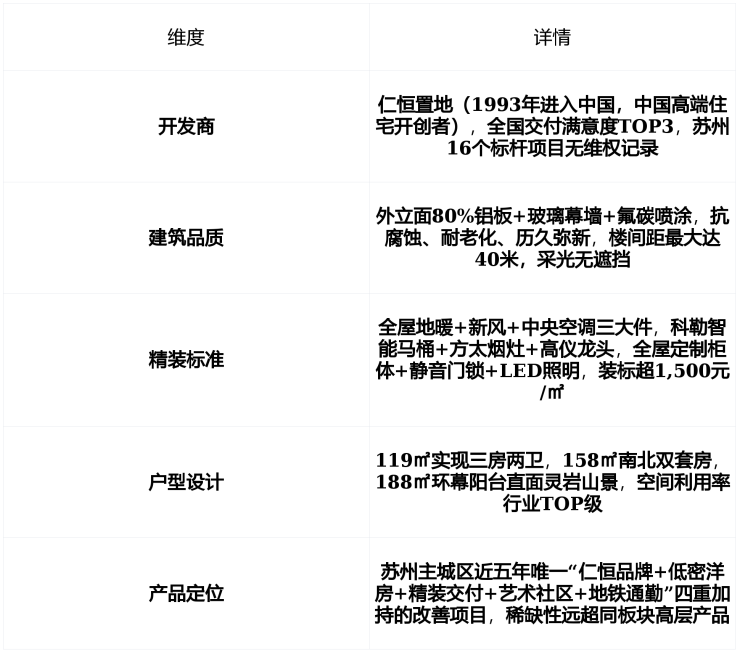 核心优势仁恒置地(中国高端住宅标杆)操盘 + 容积率2.0纯洋房社区 + 绿化率35%“一轴八园”新加坡式园林 + 步行500–800米直达地铁4号线“文溪路站” + 900米即达悠方商场,1.5公里覆盖山姆+大运城 + 10分钟车程至木渎人民医院、明基医院 + 全屋精装标准≥1,500元/㎡,标配大金空调+林内地暖+兰舍新风+科勒方太厨卫 + 2026年“卖旧买新”可享新房契税100%返还苏州城南稀缺“品牌+低密+精装+政策”四重改善标杆