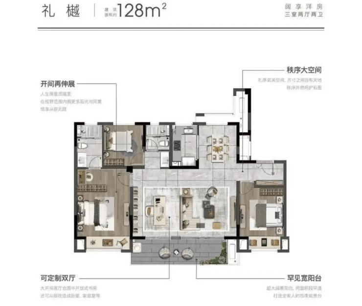 主力户型:89–103㎡三房(高层)、115–128㎡四房(洋房),得房率高达82.5%–85%,远超行业平均
