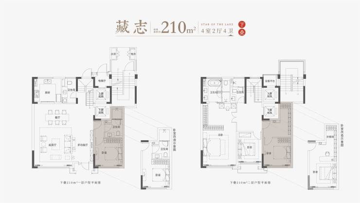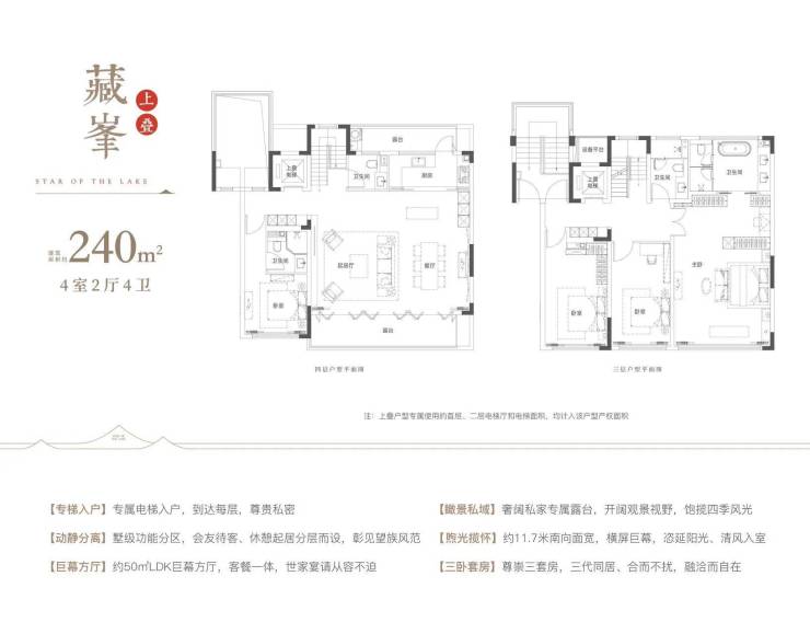 叠墅产品:建面210-240㎡四居,总价740-980万/套,下叠赠送约120㎡南北双花园