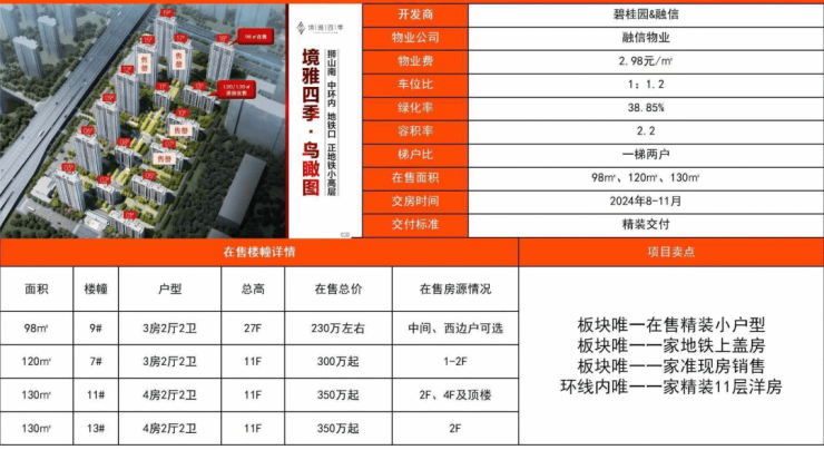 户型多样:涵盖98㎡刚需三室、120㎡改善三室与130㎡舒居四室,满足单身、三口之家及三代同堂等不同需求^。