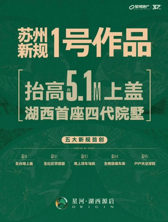 星河湖西源启是星河地产在苏州吴中郭巷板块打造的纯低密改善社区,定位为“湖西芯的品质生活样本”。项目由星河地产与天鸿伟业联合开发,星河物业(国家一级资质)提供“金钥匙联盟”级服务。项目占地约4.5万㎡,总建面约5.6万㎡,容积率仅1.25,规划24栋住宅,含22栋4层叠加别墅(167-188㎡,毛坯交付)与2栋11层四代宅洋房(141㎡,精装交付),总户数约282户。预计2026年交付,洋房均价约3.3-3.6万/㎡,叠加别墅溢价空间显著。项目以“低密+精装+会所”为核心卖点,填补苏州南部改善市场空白。