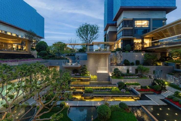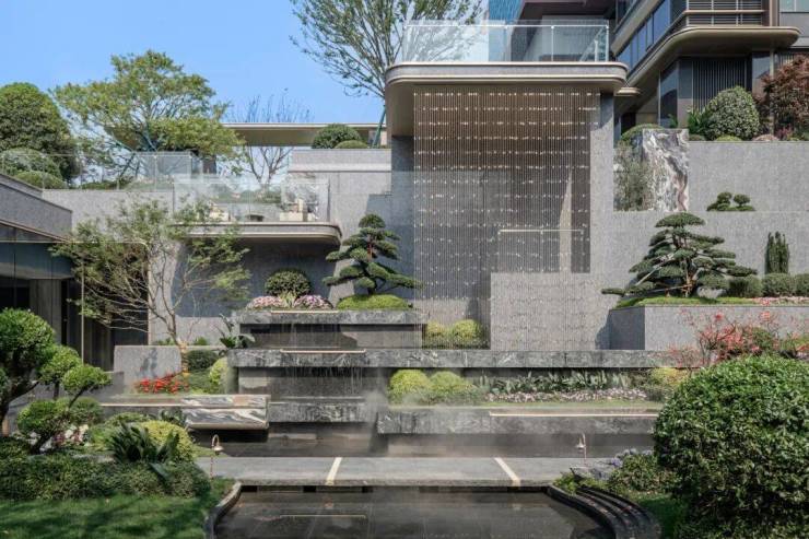 从白玉水晶会客厅的超高玻璃看出去,可见庭院的“每一米”都被不同的景色铺满,镜面般的水系、圆润可爱的灌木丛、昂扬向上的花木以及形似瀑布的金属珠帘等共同组成了灵动的立体图景,宛如置身新加坡parkroyal公园的皇家酒店。
