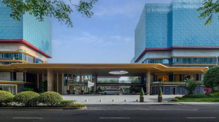 整体的抬高,让约70米宽的鎏金天幕大门头高度达到了约9米,显得格外气势非凡。天桥连接了会客厅、架空层和内部园林。
