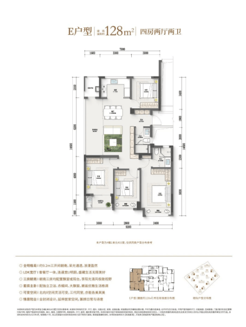 139㎡四房两卫:横厅边套设计,三卧朝南,双阳台配置,主卧套房配备独立卫浴与衣帽间,适配改善家庭。