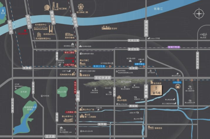 望金马府,以约1.2罕见容积率的姿态,落址萧山千年贵脉,坐享醇熟烟火气,北望北干山苍翠,东临商城河潺潺,与萧山最早的五星级酒店——金马饭店仅一路之隔。