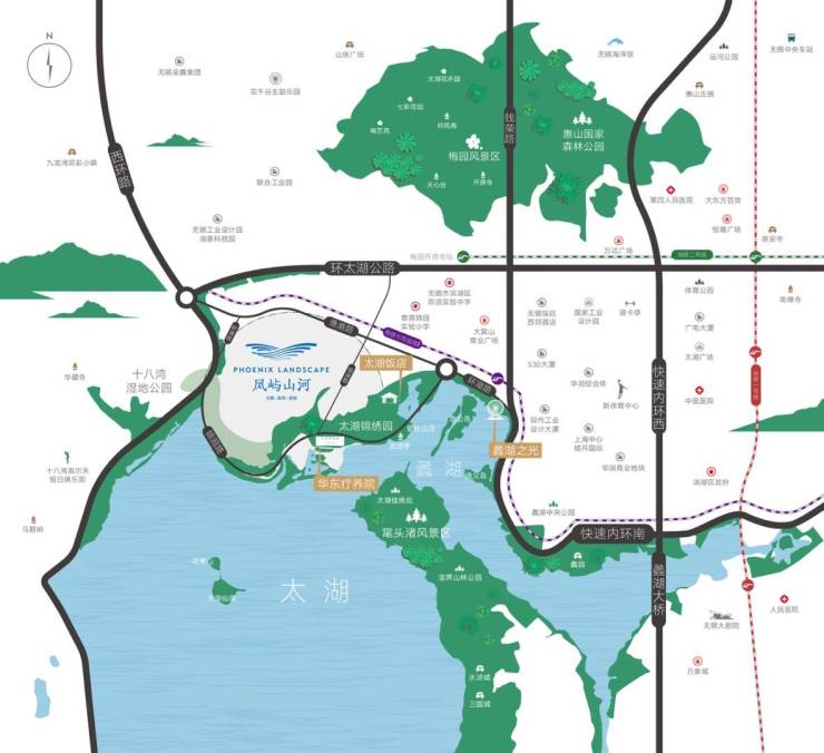 主干道:渔港路、环太湖路双主干道纵横交错,便捷通达全城