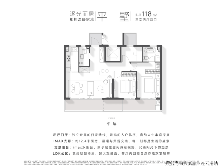 户型亮点:LDK一体化公共区域、IMAX观景阳台、下叠带庭院/上叠带露台,得房率约80%