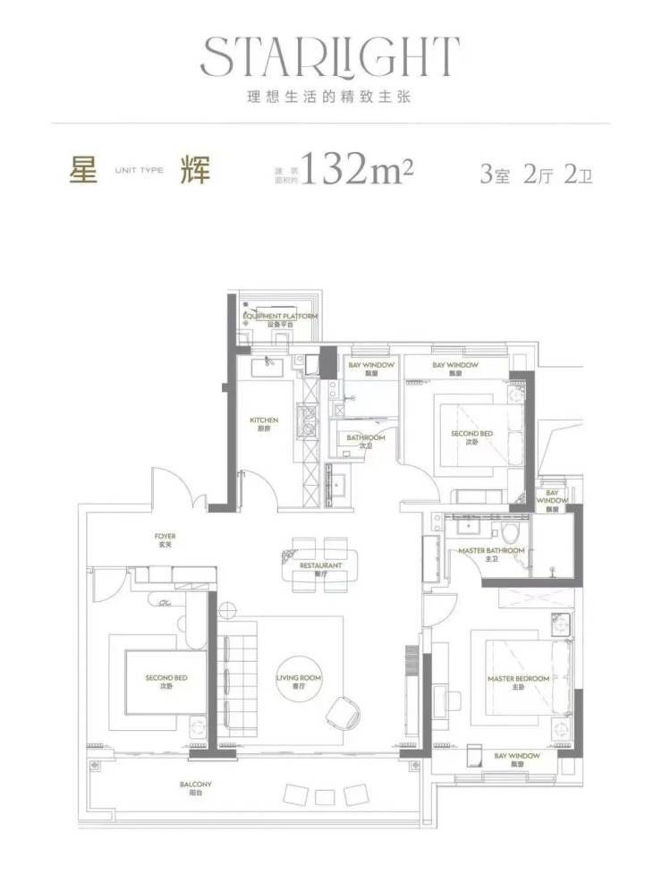 以建面约132㎡三室两厅两卫户型为例,约11.8m南向三开间,联接约8.2m南向阔景阳台,让阳光与清风常相伴。约30㎡餐客厅一体化空间,打破空间界限,让生活场景随心切换。