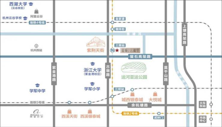 ### 四、配套设施- **商业**:周边商业配套丰富,龙湖紫荆天街距离项目直线距离仅500米,城西银泰城也在3公里范围内,同时项目还配备自建底商,全方位满足购物、休闲需求。- **教育**:教育资源优越,育才登云小学、华东师范大学附属杭州学校均在1公里内,为孩子提供优质教育环境。- **医疗**:医疗设施完善,浙江省立同德医院距离项目约3公里,杭州师范大学附属医院也近在咫尺,为健康保驾护航。- **生态**:项目周边生态环境优美,运河亚运公园步行约10分钟即可到达,留石公园也在邻近位置,社区内部打造了新加坡酒店式园林景观,居住环境宜人。