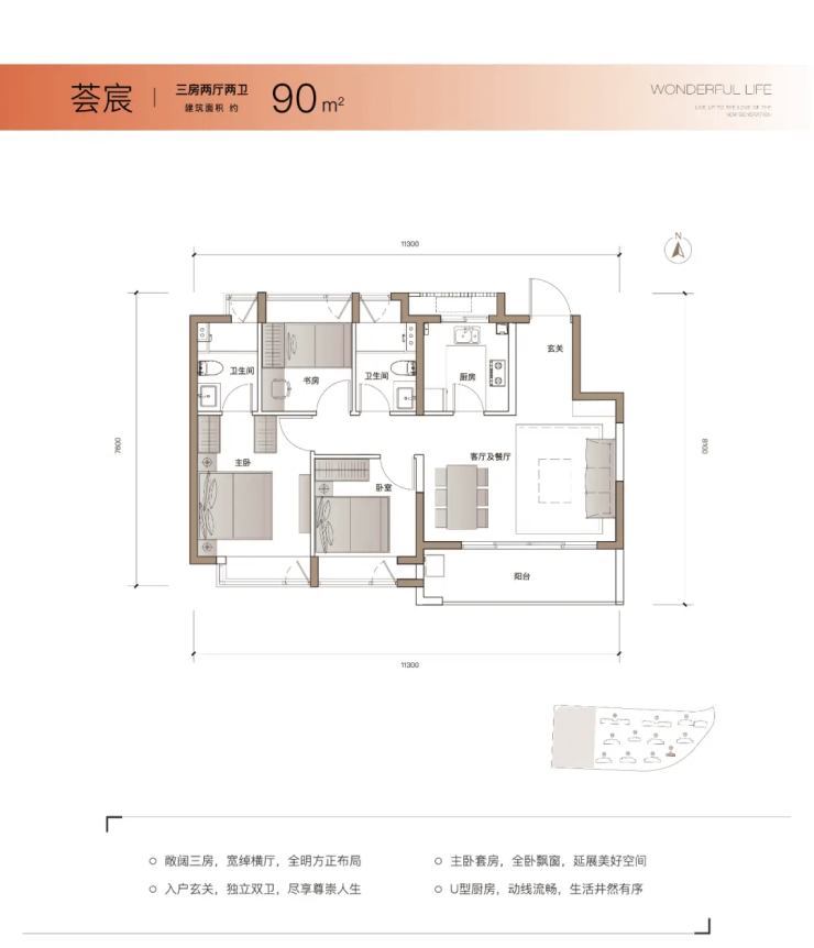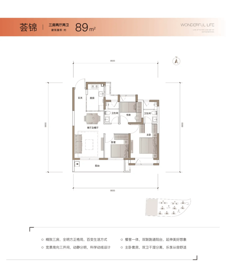 约88–89㎡三房两厅两卫:南北通透,主卧套房设计,约6米双联阳台,空间感超越同级产品