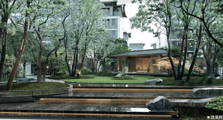 中式园林设计,亭台水景、归家动线、四季景观层层递进,非“草坪+凉亭”式简单绿化。