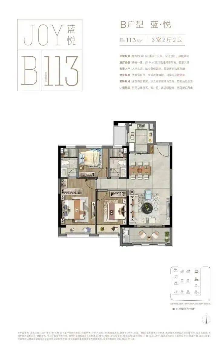 :南北通透,三开间朝南,动静分区,主卧套房设计,U型厨房。