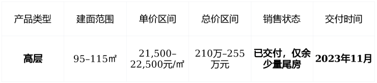 销售现状 : 2023年底已集中交付 ,目前 无新批次开盘 ,市场流通房源为二手房,价格稳定在21,500–22,500元/㎡区间。
