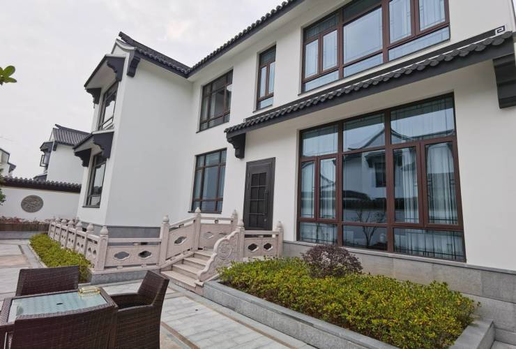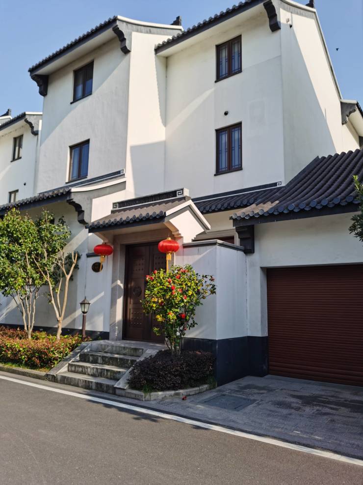 采用纯中式粉墙黛瓦风格,强调"宅院合一"理念