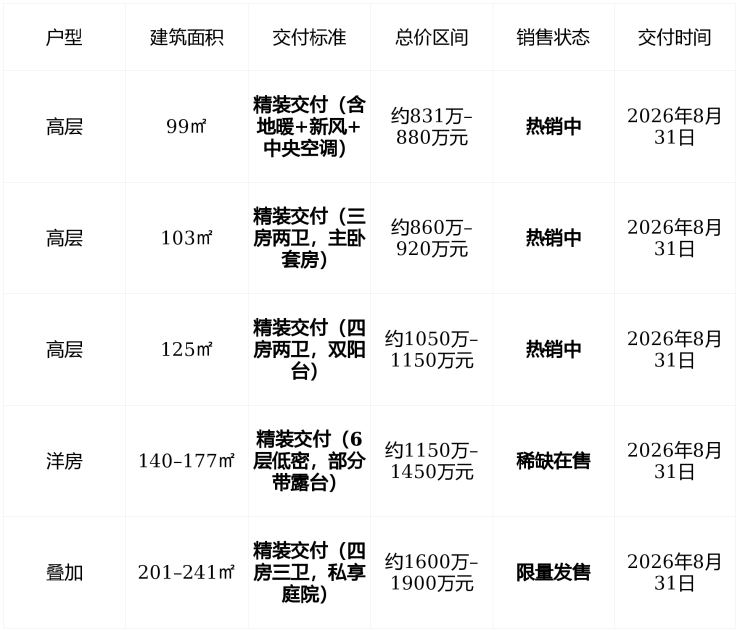 在售状态 : 建面99–241㎡精装高层/洋房 , 均价8.2–8.38万元/㎡ , 总价800万–1200万元 , 2026年8月交付 , 得房率约86% , 仁恒物业,物业费7元/㎡·月 。