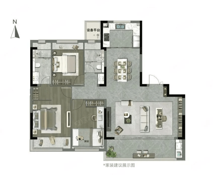 主力户型为103-135㎡精装三至四房,覆盖刚需与改善需求,户型方正,空间利用率高。