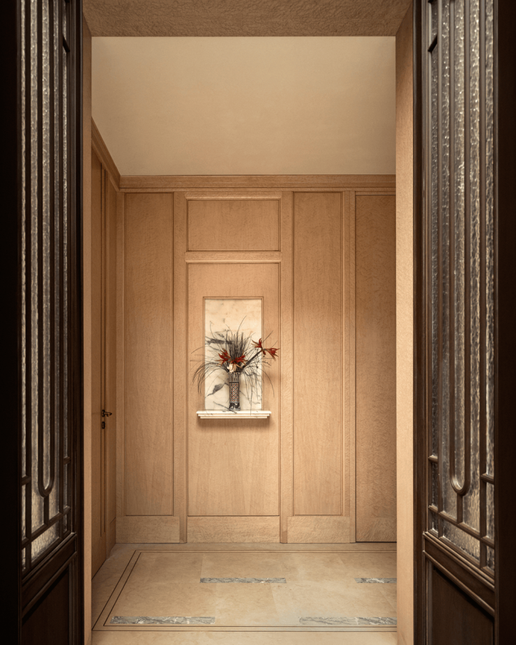通过2种不同样式的过街门楼 ,延续了原市房现代简洁、过街楼装饰艺术风格特征以及连续界面等特点,不仅让归家更富有层次感,更凸显着海派生活场景的摩登魅力。