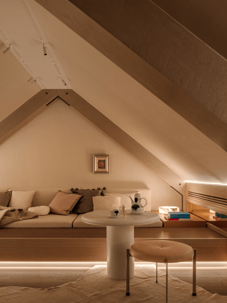 设计释放原用于储藏的阁楼空间,将这里转化为主卧的功能延伸。阁楼既是男女主人的专属活动区,也是陪伴孩子的静谧角落。