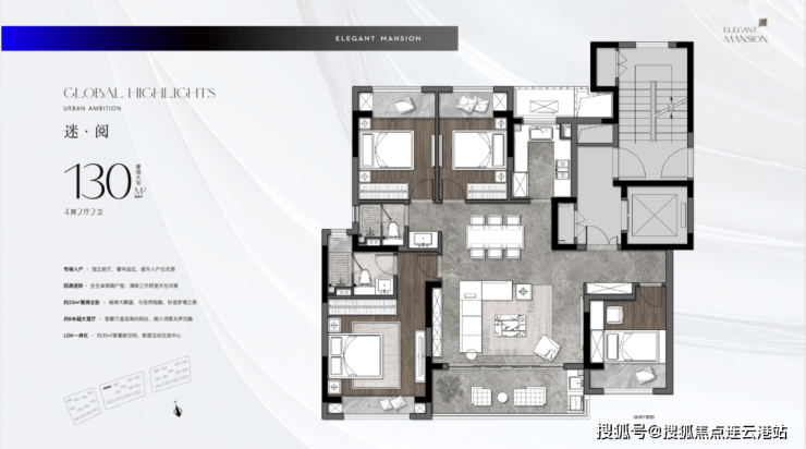 【户型亮点】私家电梯入户+独立入户玄关,私密性强。约5.6米的横厅+面宽约8.6观景阳台,采光、通风性能佳。双套房设计,让改善更彻底。
