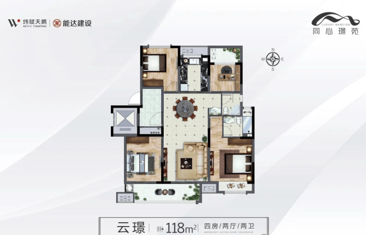 118㎡(4室2厅2卫)得房率79%-82%南北通透宽境阳台+对开门电梯