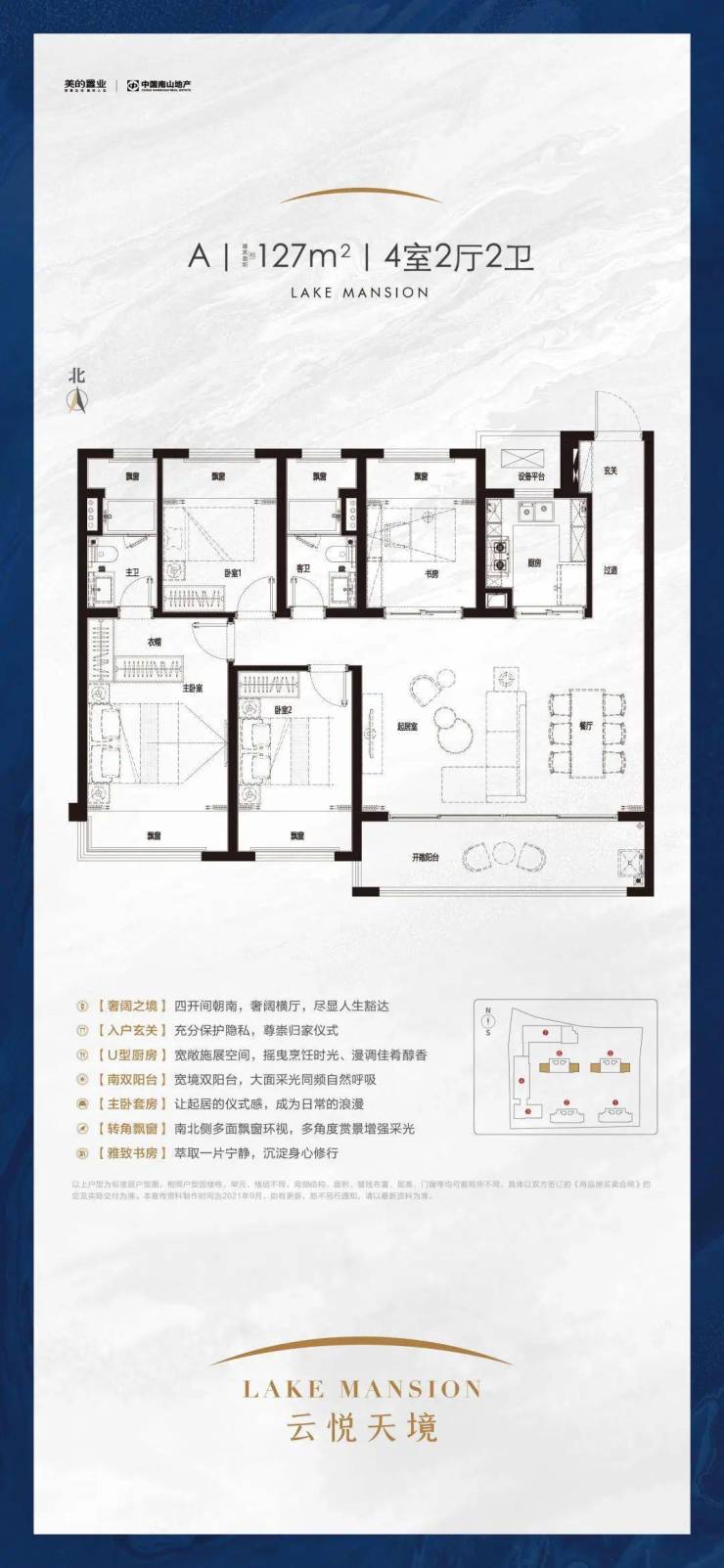 建筑面积约127 ㎡ 四房两厅两卫的奢华户型,此户型格局方正,南北通透,是目前改善之家的优选户型。 该户型四开间朝南、客餐厅双厅相连,约6.6米横厅设计,宽敞大气、充足采光; 南向阔景双阳台设计,且全屋包含6个大飘窗,可环幕观景,整体户型使用率非常高,在整个苏州市场都尤为罕见。该户型基于品质改善为设计主导方向,更注重的是生活的舒适感和尊享感,不论得房率、功能性、舒适度、使用性都可称优越。