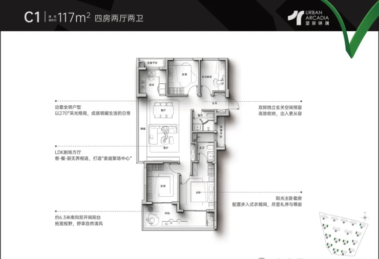 在售户型:主力在售户型为建面约97㎡、100㎡的三房两厅两卫,以及建面约117㎡的四房两厅两卫。部分户型设计有南向双阳台或转角阳台,视野较好。