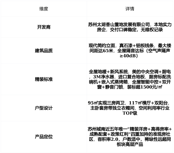 核心优势苏州城南稀缺“精装洋房+高得房率+成熟配套”组合 + 步行158米直达“水桥头”公交站 + 3公里内地铁4号线“太湖香山站” + 4所小学+2所中学环绕,教育资源密集 + 3公里内太湖中心Mall+社区商业全配套 + 周边61个公园,生态宜居 + 2026年“卖旧买新”享契税100%返还性价比远超同板块竞品