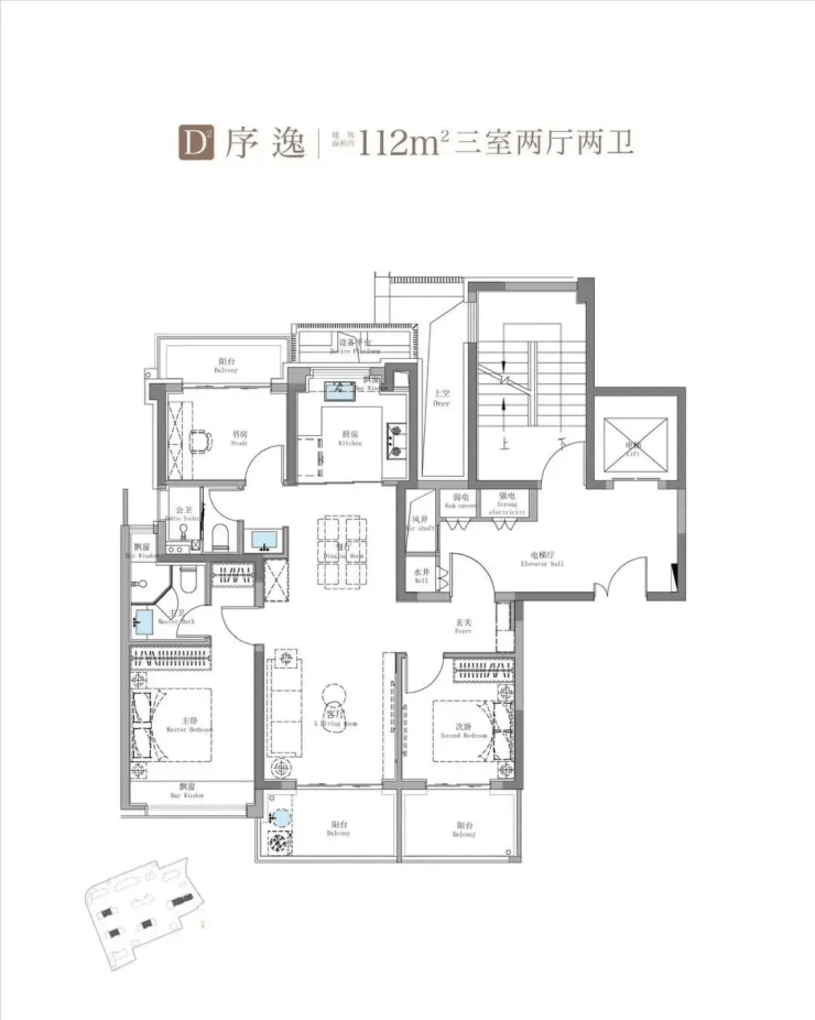 101㎡三房:三开间朝南,5.1米南向阳台,S墙收纳+270°转角飘窗,双卫设计,主卧套房;